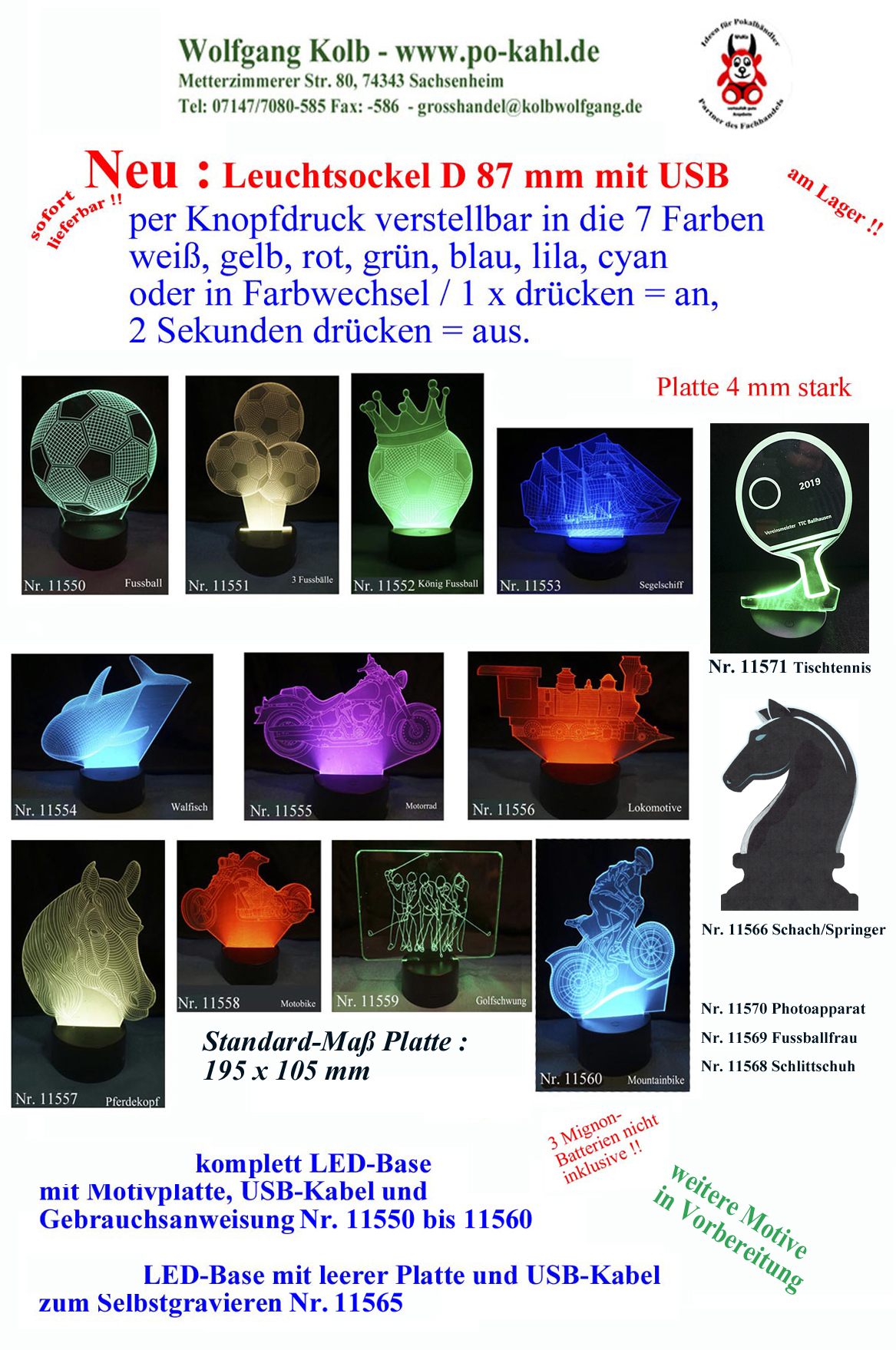 LED-Base rund 87 mm Durchmesser, per Knopfdruck in 7 verschiedenen Farben leuchtend und beim 8. Mal permanenter Farbwechsel möglich. Zwei Sekunden Druck schaltet dden Leuchtsockel aus. Batteriefach für 3 Mignon vorhanden oder Betreiben mit mitgeliefertem USB-Kabel. Eingesteckt wird eine gelaserte Acrylglasplatte mit 4mm Stärke. Gestaltung dieser Platte individuell möglich. Zahlreiche Lagermotive am Lager aus den Bereichen Weihnachten und Sport.